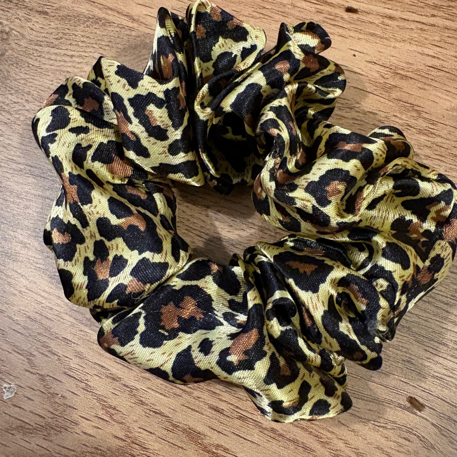 Elevate your everyday hairstyle with this luxurious leopard-print scrunchie, designed to add a bold touch of style to any look. Made with smooth, satin fabric, it features a striking golden-yellow and black animal print pattern that instantly stands out. The soft yet durable elastic ensures a secure hold without pulling or damaging your hair, making it perfect for all-day wear.